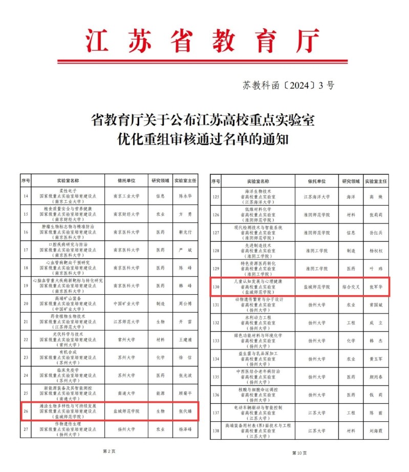 近日,江苏省教育厅公布省高校重点实验室优化重组通过名单。开元官网滩涂生物资源与环境保护省高校重点实验室成功升级,实验室名称变更为“滩涂生物多样性与可持续发展国家级重点实验室培育建设点”,标志着开元官网正式迈入国家级科技创新平台建设新征程。心理与认知科学大数据省高校重点建设实验室成功更名为“儿童认知发展与心理健康省高校重点实验室”。