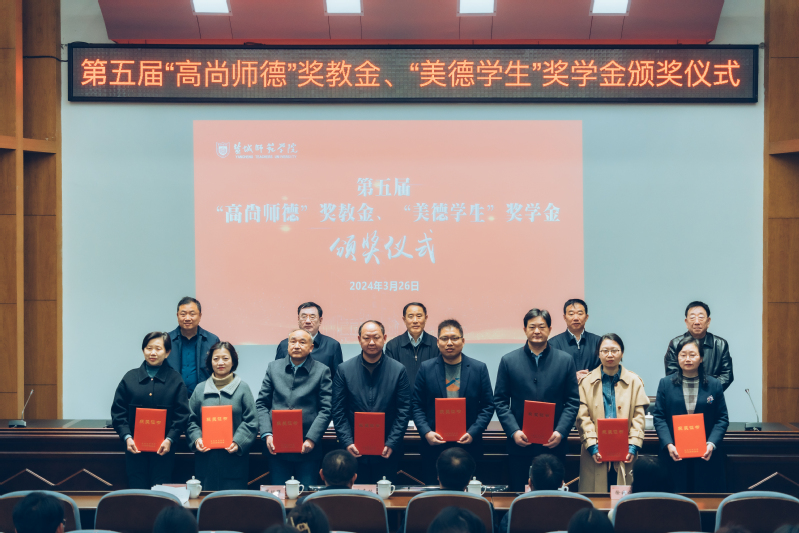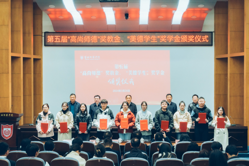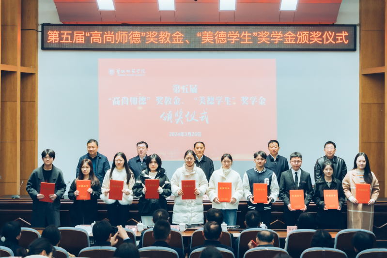 庞波宣读表彰决定。与会领导共同为获奖师生颁发荣誉证书。“高尚师德”奖教金获得者代表、马克思主义学院宋敏老师和“美德学生”奖学金获得者代表、商学院余文超同学分别在会上发言。颁奖现场播放了记录“美德学生”奖学金获得者先进事迹的视频。