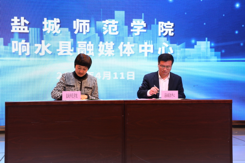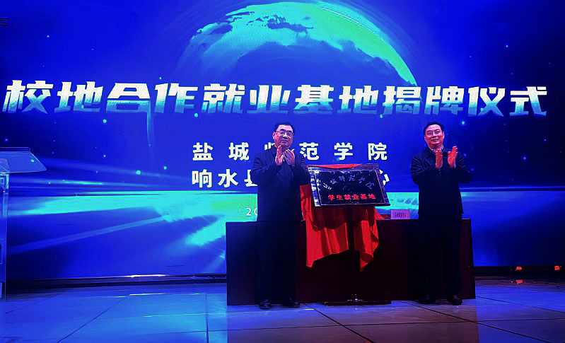 庞波为校地合作就业基地揭牌,李尧与响水县融媒体中心签订校地合作就业基地协议。