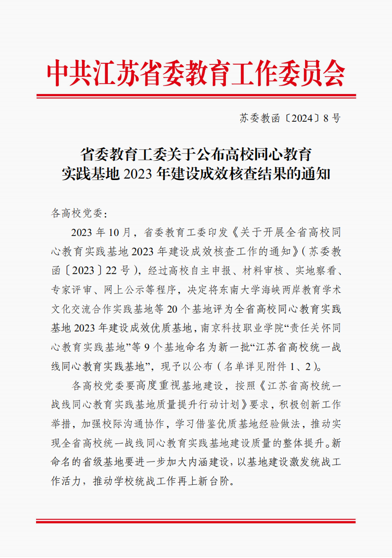 近日,江苏省委教育工委发布《关于公布高校同心教育实践基地2023年建设成效核查结果》(苏委教函〔2024〕8号)的通知,经过自主申报、材料审核、专家评审、网上公示等程序,开元官网“同心共育石榴红”教育实践基地成功入选全省高校同心教育实践基地2023年建设成效优质基地,本次全省共有20所高校入选。