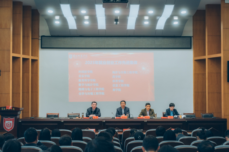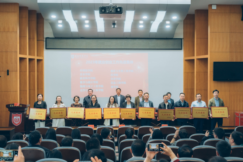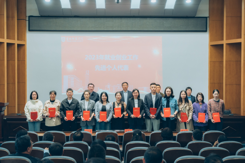 毕凤珊宣读2023年度就业创业工作先进集体和个人表彰决定。与会校领导为2023年度就业创业工作先进集体、先进个人代表颁奖。