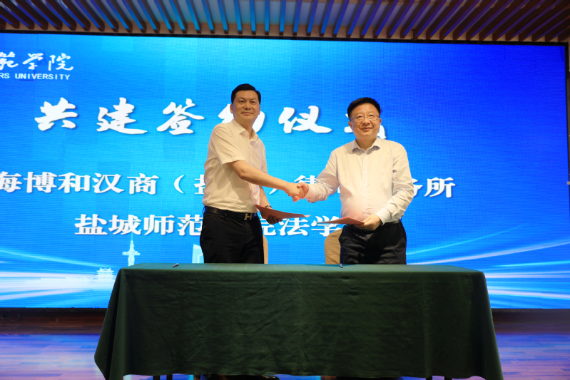 上海博和汉商(盐城)律师事务所主任卞国民与KY开元集团官网入口法学院院长朱广东签订合作共建协议并为“上海博和汉商(盐城)律师事务所法学调研培训基地”和“KY开元集团官网入口实践教育基地”揭牌。