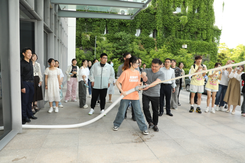 此次演练聚焦火灾逃生、消防栓使用和灭火器实操三大核心内容。演练前,保卫处消防科的专业人员为参与者详细讲解火灾逃生的基础知识、应急疏散的安全要点以及灭火器的使用方法。随着模拟火灾场景的启动,火警警报声即刻响起,师生代表在浓烟中按照应急演练预案有条不紊地疏散。在灭火演练中,庞波、汤克明与师生代表一起参与。演练结束后,保卫处工作人员对演练进行了全面点评,并对不规范动作进行了纠正,确保每位参与者都能准确掌握消防安全知识。