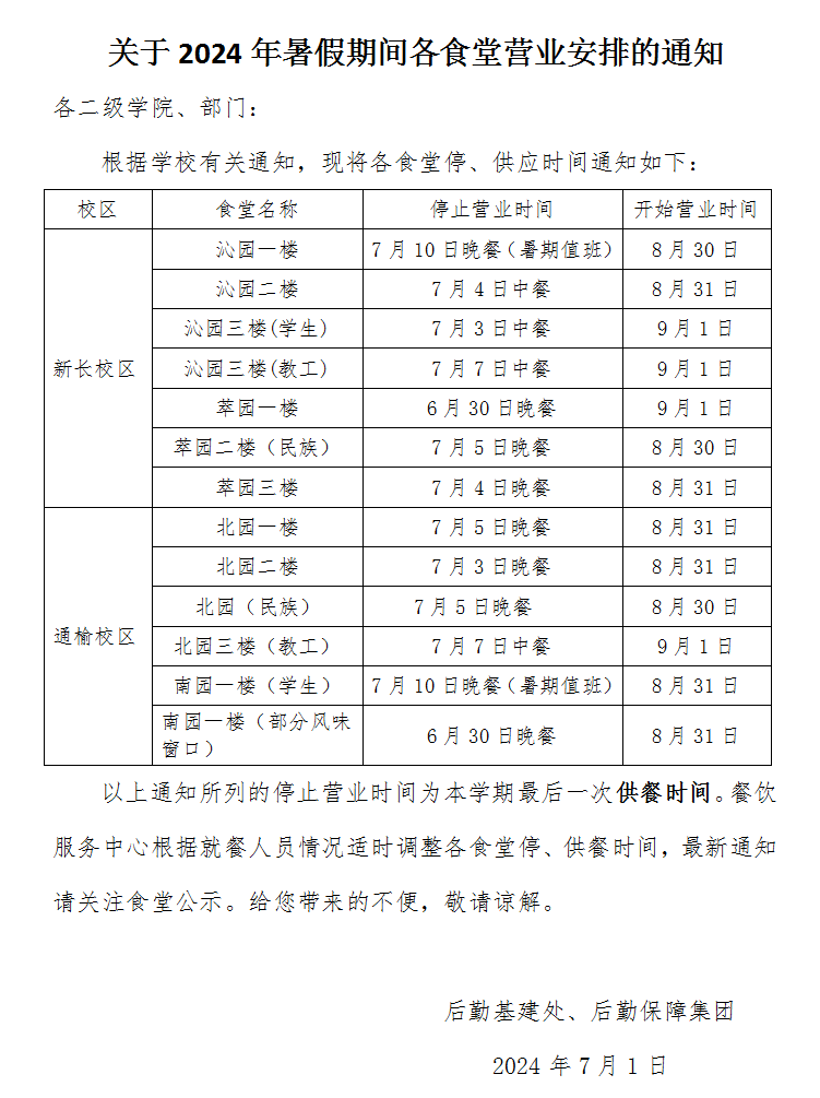 关于2024年暑假期间各食堂营业安排的通知