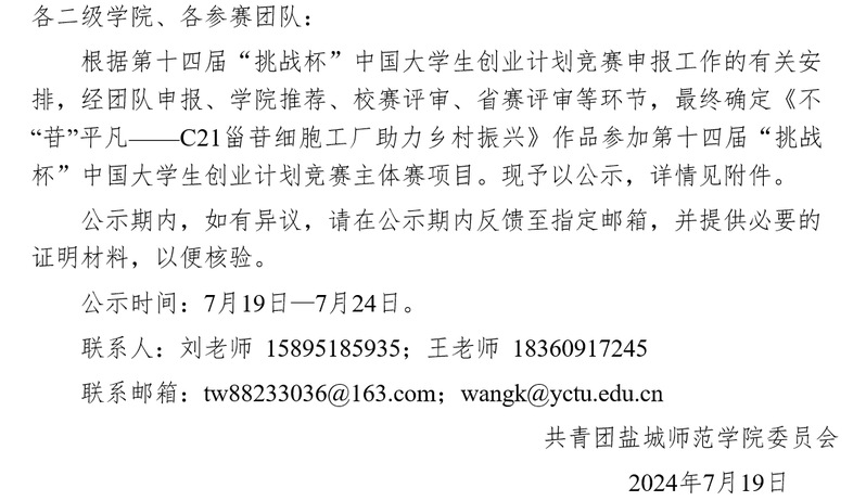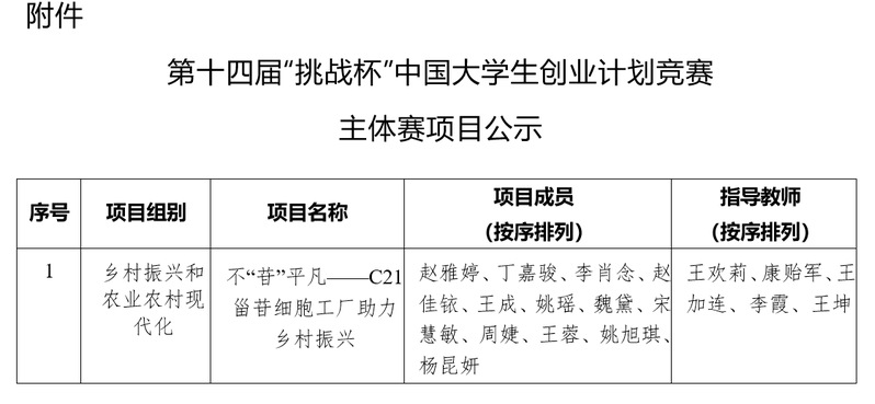 关于推荐第十四届“挑战杯”中国大学生创业计划竞赛主体赛项目的公示