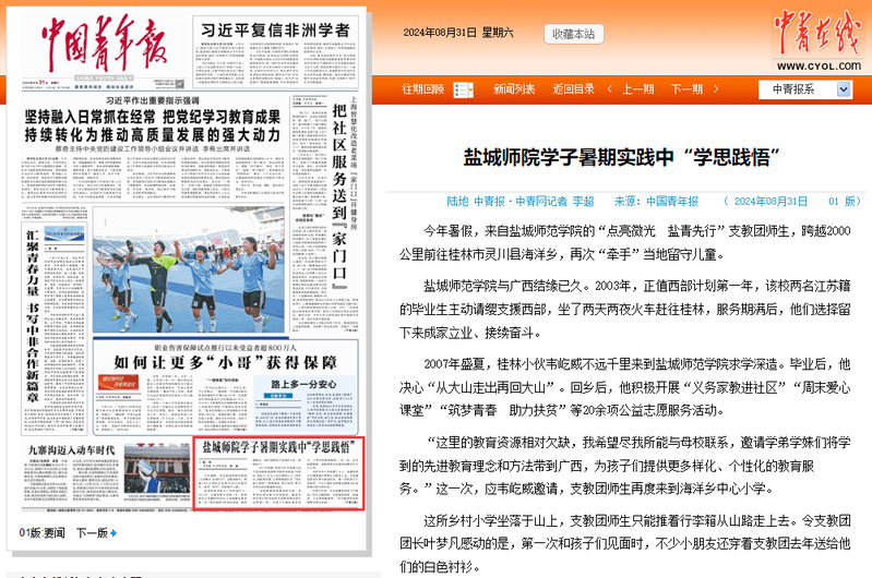 8月31日,《中国青年报》头版以《盐城师院学子暑期实践中“学思践悟”》为题报道开元官网暑期社会实践成果。