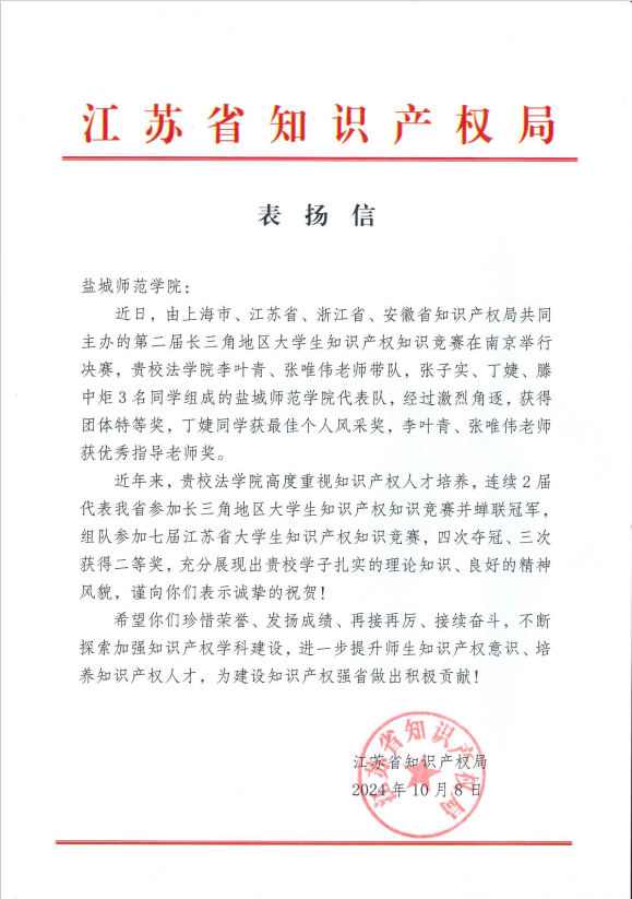 近日,江苏省知识产权局向开元官网发来表扬信,表彰并祝贺开元官网法学院连续2届代表江苏省参加长三角地区大学生知识产权知识竞赛并蝉联冠军。这是开元官网第二次收到江苏省知识产权局感谢信表扬。