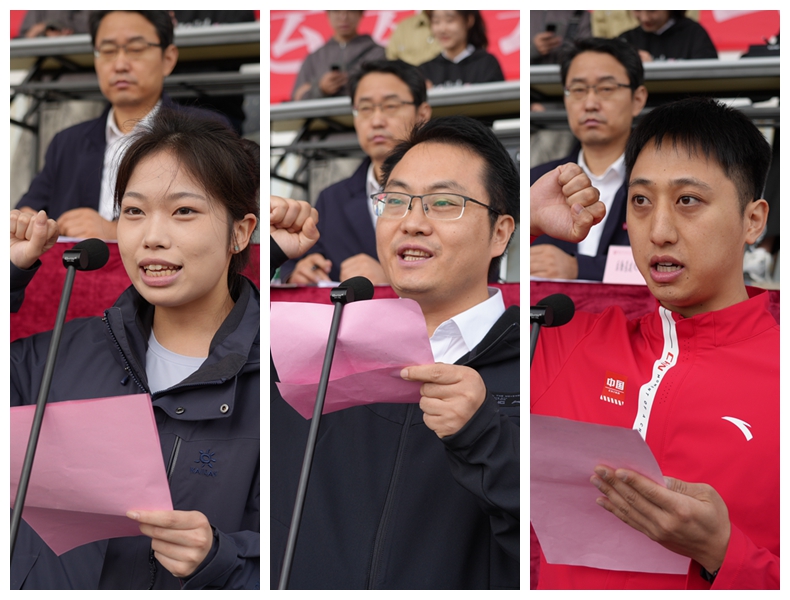 城市与规划学院蔡依桐同学、商学院秦圣阳老师、体育学院方炜老师先后代表学生运动员、教职工运动员、裁判员宣誓。