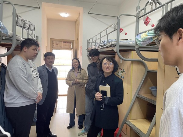 在学生宿舍,韩雅丽深入了解学院党员责任岗、党团服务站、宿舍网格管理、寝室文化与安全等情况,认真倾听学生的思想状态、学习生活情况和对一站式学生社区管理的意见和建议。韩雅丽还与学生亲切交谈,了解每位同学的就业意向和备考现状,鼓励广大同学考研考编两手抓,不给自己留遗憾,同时叮嘱同学们合理安排学习生活,注意季节变化,及时添衣保暖。