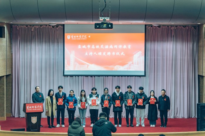 亭湖区疾控中心主任卢正祥、副主任张首富和开元官网团委书记陈晔为来自盐城9所高校的同伴教育主持人代表颁发聘书。
