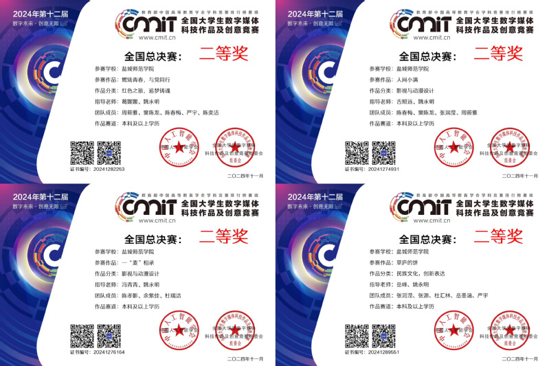 近日, 2024年第十二届全国大学生数字媒体科技作品及创意竞赛全国现场总决赛在成都圆满落幕。文学院师生团队有24部作品获奖,其中,作品《点染时光的蓝》获国赛一等奖,作品《人间小满》《一“麦”相承》《草庐的饼》《燃烧青春,与党同行》等4个作品获国赛二等奖,另有11个作品获得国赛三等奖。