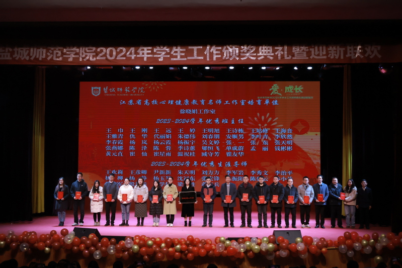 颁奖典礼上,与会领导先后为2024级新生入学教育工作先进集体、2023-2024学年“王强班”、2024年度“一站式”学生社区寝室文化大赛先进集体、2024年学生考研工作先进集体、2024年暑期社会实践活动先进集体、2024年招生工作先进集体、第26届“创新杯”科技文化艺术节创新杯及先进集体、江苏省高校心理健康教育名师工作室培育单位——“徐晓娟工作室”、2023年优秀心理工作者、第20届5·25大学生心理健康节最佳组织奖、2024年江苏省高校辅导员年度人物提名奖、2023-2024学年优秀辅导员、2023-2024学年优秀班主任和优秀生涯导师、第25个青年志愿者学雷锋活动奉献杯及先进集体、2024年学风建设月活动先进集体、2024年度十佳社团、第9届大学生创新创意创业大赛优秀组织奖等先进集体和个人颁发荣誉证书与奖牌。