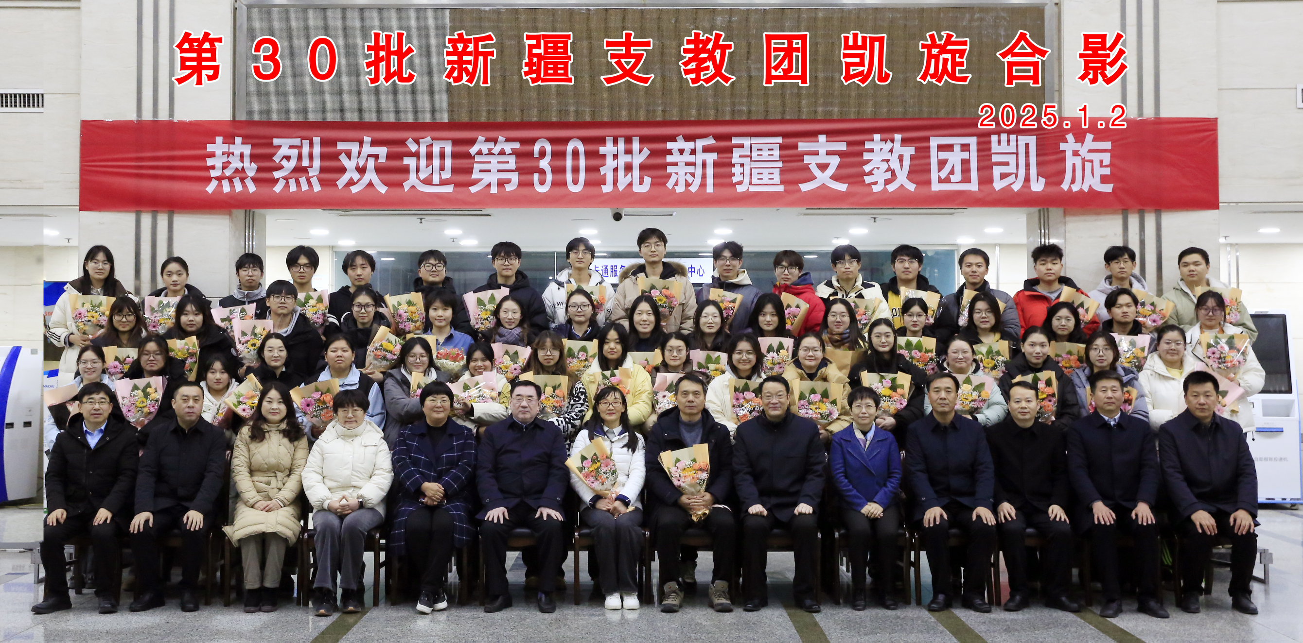1月2日下午,开元官网第30批新疆支教团圆满完成支教任务顺利返校。学校在通榆校区教学主楼南大厅为支教师生举行欢迎仪式,学校党委书记张玉勤,党委常委、副校长庞波、毕凤珊出席欢迎仪式。