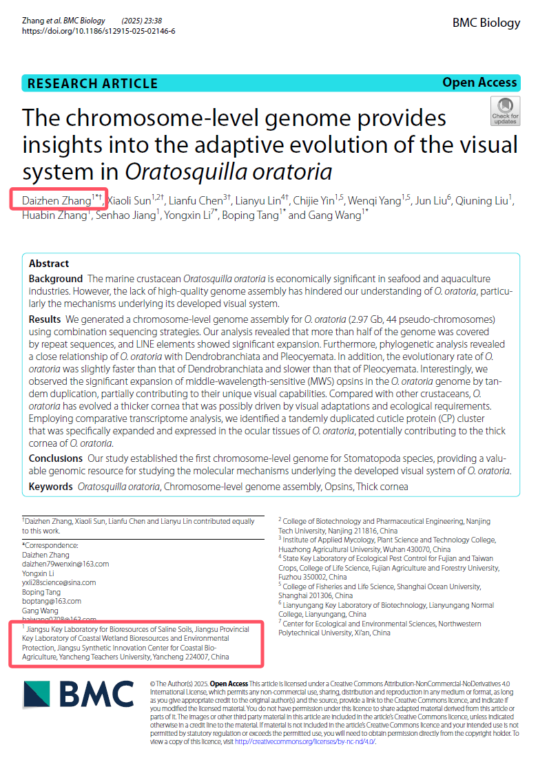 近日,开元官网生物进化研究团队在国际知名期刊《BMC Biology》上发表了题为“The chromosome-level genome provides insights into the adaptive evolution of the visual system in Oratosquilla oratoria”的论文。