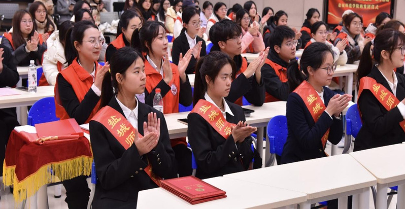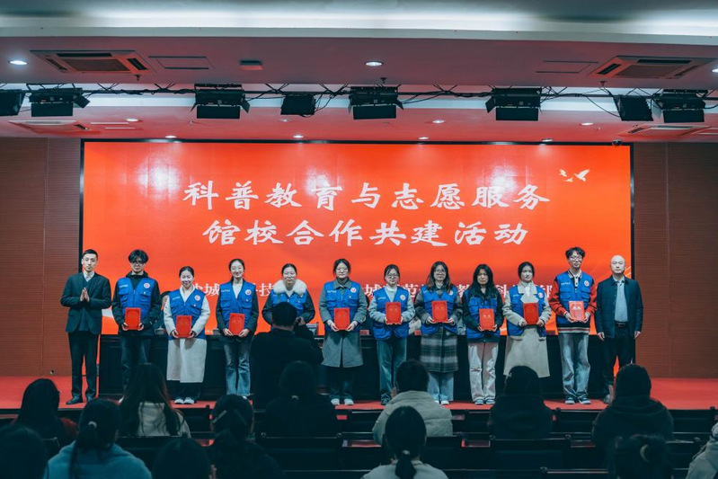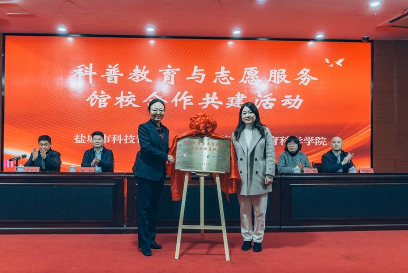 启动仪式上,教育科学学院与盐城市科技馆签约共建“科普教育与志愿服务协同创新基地”。馆校共同签署《科普教育与志愿服务协同创新基地合作协议》,为“科普教育与志愿服务协同创新基地”揭牌,并为志愿者代表颁发聘书。