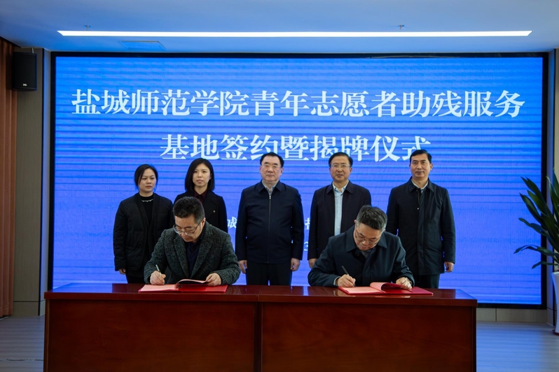 施政与孙玉峰共同签署共建协议,市残联副理事长王春林与陈晔共同为青年志愿者助残服务基地揭牌。