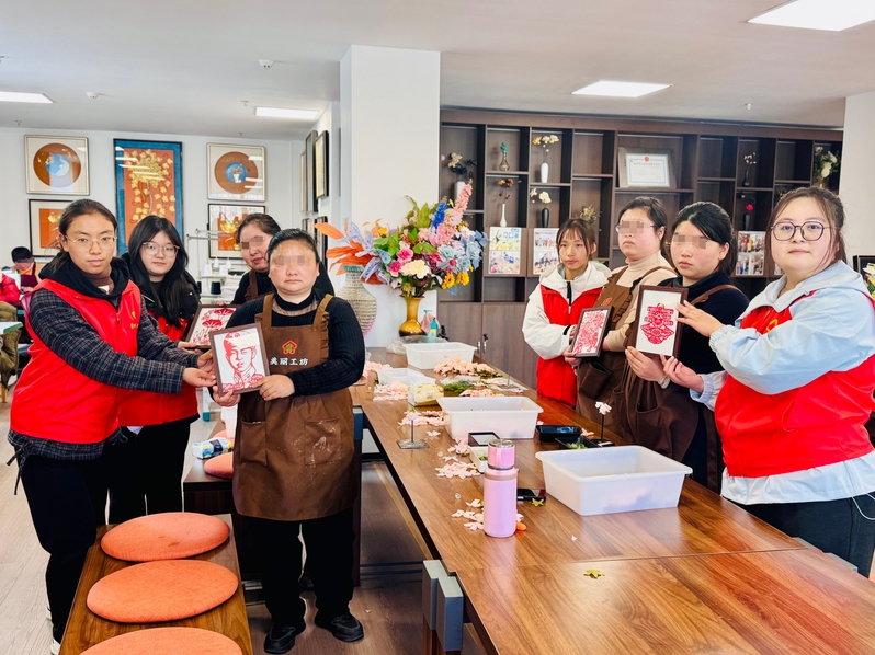 会前,与会人员共同参观德爱大厦,“赤子学社”志愿者一同参加活动并向“美丽工坊”残疾人朋友赠送亲手制作的“学雷锋”剪纸作品,寓意残疾人朋友在志愿者的陪伴帮助下,乐观向上、自强不息,用自己的双手创造美好生活。