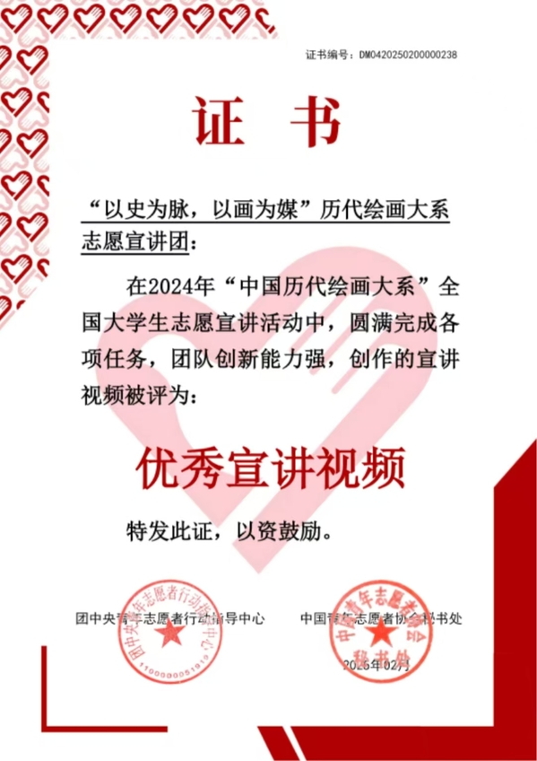 近日,由团中央青年志愿者行动指导中心、教育部中外语言交流合作中心、中国外文局文化传播中心、浙江大学、中国文物报联合举办的2024年“中国历代绘画大系”全国大学生志愿宣讲活动评选结果揭晓。开元官网美术与设计学院“以史为脉,以画为媒”志愿宣讲团创作的宣讲视频获评“优秀宣讲视频”。
