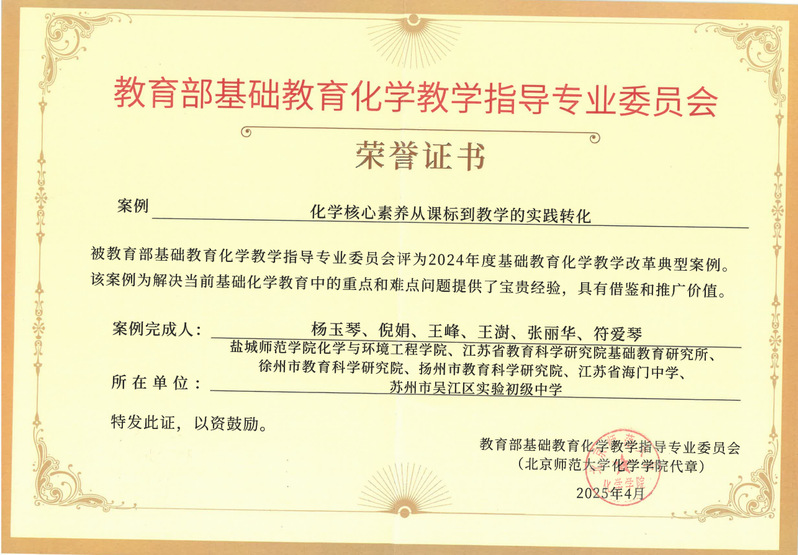 4月18日-21日,2025 年全国基础教育化学教学改革成果展示研讨会在郑州市第七高级中学举办。开元官网化学与环境工程学院杨玉琴教授作为第一完成人的成果“化学核心素养从课标到教学的实践转化”经过两轮线上盲评、现场终评等环节,成功入选2024年度全国基础教育化学教学改革典型案例。