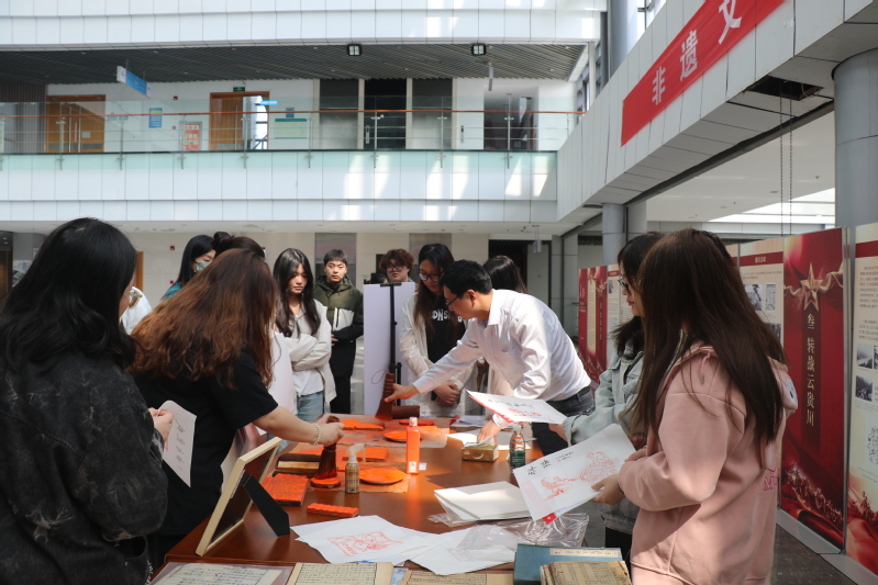 在“非遗文化进校园”现场,省级非遗项目“冈西剪纸”代表性传承人唐进文和古籍修复与装帧非遗传承人戚九龙走近盐师,为师生们带来沉浸式文化盛宴。唐进文介绍剪纸的历史渊源、艺术风格及文化内涵,并现场展示了剪纸技艺。戚九龙带来雕版印刷和古籍装帧展示,他详细讲解古籍修复的意义、历史渊源及雕版印刷的技艺流程,师生可以现场动手体验雕版印刷 “刷墨、铺纸、拓印” 的经典流程。