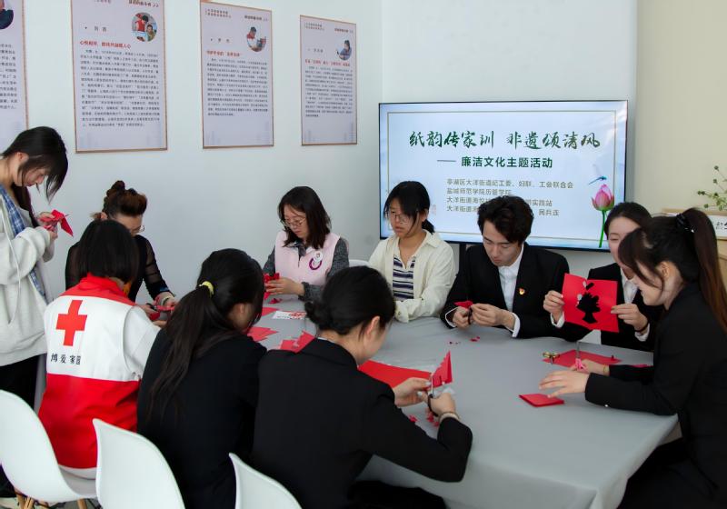5月7日下午,历史与公共管理学院学生党支部联合亭湖区大洋街道纪工委、大洋街道海悦社区党总支举办“纸韵传家训·非遗颂清风”廉洁文化主题活动,共同倡导树立优良家风。活动现场,学生党员、入党积极分子、街道党员干部和社区工作人员集体创造清廉家风主题剪纸。大家精心构思、细致描摹,经过起稿、剪刻、揭离等步骤,一幅幅蕴含深意的剪纸作品跃然而出。大家还结合自身学习、工作和生活实际,分享对清廉家风的认识。学生入党积极分子李雨桐同学还分享廉洁故事《军令如山重 ,绵绵鱼水情》,共同回顾新四军拥政爱民的光荣传统。