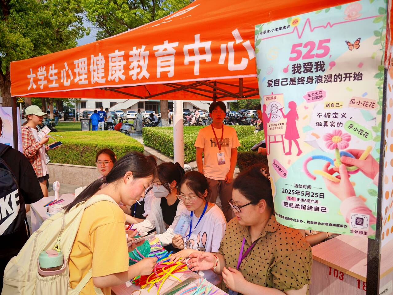 自4月起,心理健康节围绕“五育润心”主题推出系列赛事。心理委员技能大赛暨“校十佳心理委员”评选、师范生心理育人技能大赛、全国心理健康教育微课视频比赛等赛事吸引全校学生积极参与,累计征集作品千余份。5月14日,新长校区体育馆门前举办首场心理嘉年华,商学院组织的解压游戏、物理与电子工程学院“音乐与艺术碰撞”互动展演、湿地学院“耕心育德·劳动启智”园艺沙盘等活动,吸引大批学生驻足体验。5月21日,通榆校区同步开展“心灵奇遇,打卡春熙”游园闯关活动,学生通过完成情绪解码、手作非遗等任务集章兑奖,在趣味中释放压力。