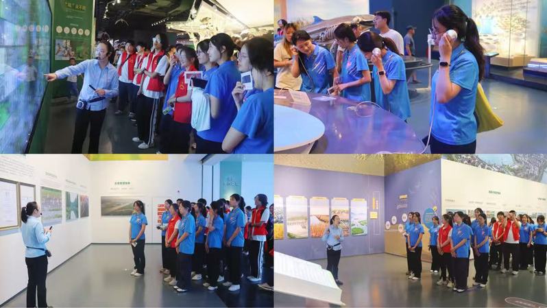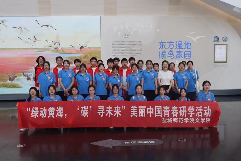 仪式结束后,“绿索山河,‘碳’寻未来” 实践团走进中国黄海湿地博物馆开展研学。从候鸟栖息地修复工程,到生物多样性监测网络,通过聆听讲解和沉浸式体验,实践团成员近距离认识勺嘴鹬等珍稀候鸟,以及碱蓬等湿地植物,深入了解了湿地在维持生物多样性、保护濒危物种中的重要作用。