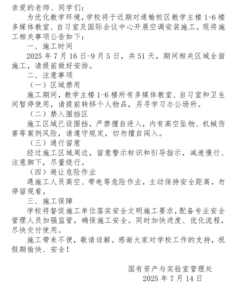 关于暑期通榆校区教学主楼1-6楼空调安装施工的公告