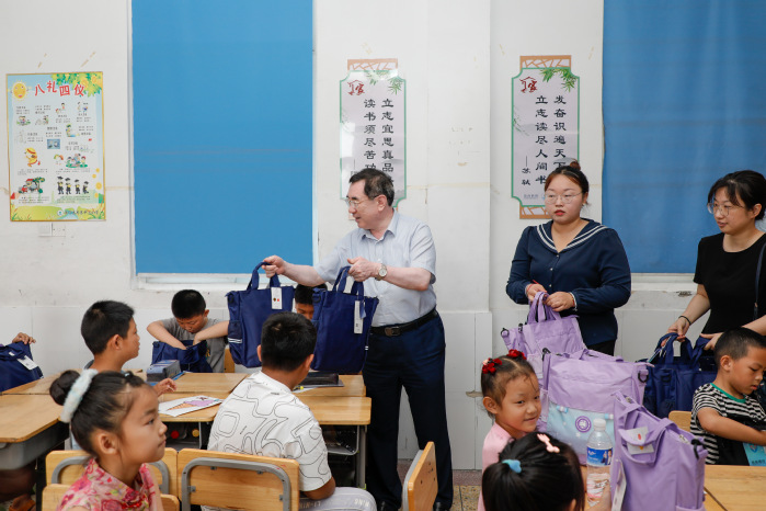 在羊寨镇中心小学,庞波走进暑托班课堂,与留守儿童亲切交流,详细了解他们的学习生活状况,并为他们送上精心准备的学习用品。他勉励志愿者充分发挥专业优势,将理论知识转化为教学实践创新,通过丰富多彩的教学活动,为乡村儿童打开知识的新窗口。