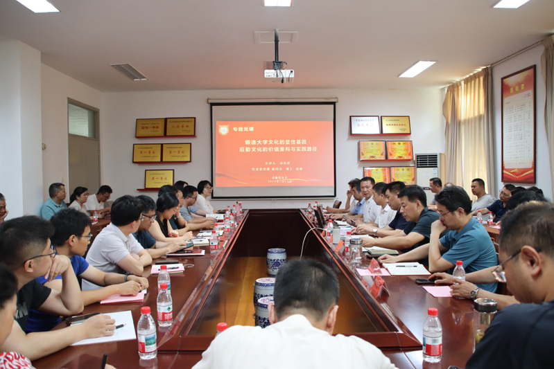 7月19日下午,学校党委常委、副校长汤克明在后勤综合楼会议室为后勤系统党员干部讲授以“锻造大学文化的显性基因:后勤文化的价值重构与实践路径”为主题的专题党课。后勤党总支书记刘振亚主持党课。