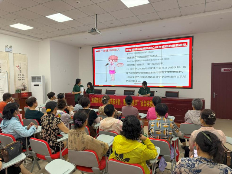 在扬州,推普活动立足不同场景需求,以多样化形式推动普通话融入乡村生活。宝应县安宜社区聚焦老年群体,结合其生活场景与学习特点,开设日常用语小课堂,编创普通话口诀,准备图文学习手册,互动环节氛围热烈,活动尾声还捐赠学习资料方便老人复习。在邗江区花城村委会,志愿者采用讲台宣讲与座谈交流相结合的方式,借助PPT阐释普通话的时代意义,与村干部围绕推普难点、村民需求及与乡村振兴结合路径等深入探讨。在迎春社区,以“推普进乡村,共筑振兴梦”为主题,先开展主题讲座,再通过普通话趣味挑战赛科普相关知识,鼓励居民参与学习。