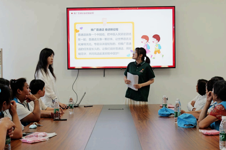 在盐城凤凰社区中,实践团开设专题讲堂介绍普通话相关知识,随后通过普通话挑战赛加强互动;盐城海天集团的活动融合推普与职业规划,企业负责人带领志愿者参观并介绍企业情况,工作人员为同学们解读职业方向、解答疑惑,让同学们对职业发展有了更多理解。