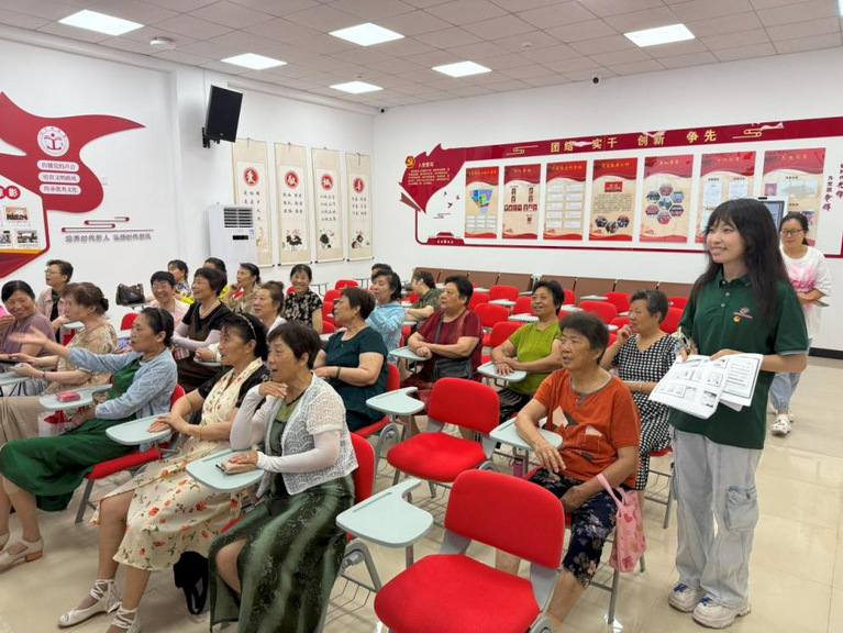 在泰州市海陵区迎春社区,重点了解老年居民日常沟通难点、学习意愿,并开展推普宣讲和一对一常用语教学。调研发现,社区老年人普遍以本地方言交流为主,对学习普通话有热情但存在畏难情绪,日常就医、办事时沟通障碍明显。团队成员结合本地生活场景,编制包含问路、购物、就医等内容的《社区生活普通话实用手册》,通过慢速朗读、情景模拟等方式耐心辅导,在轻松氛围中提升学习兴趣和效果。