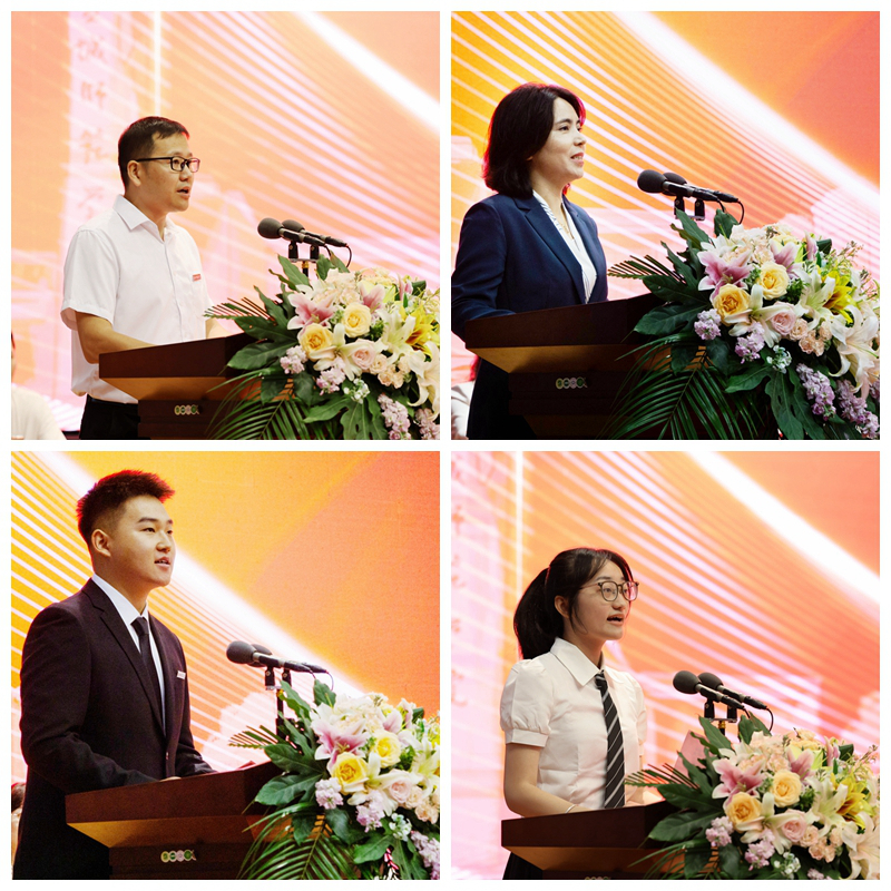 开学典礼上,数学96届校友、盐城市景山中学党总支书记陈艳作为校友代表发言,湿地学院葛宝明老师、马克思主义学院2022级本科生金炜程、绿色低碳学院张雅文作为教师代表、高年级学生代表、新生代表分别发言。