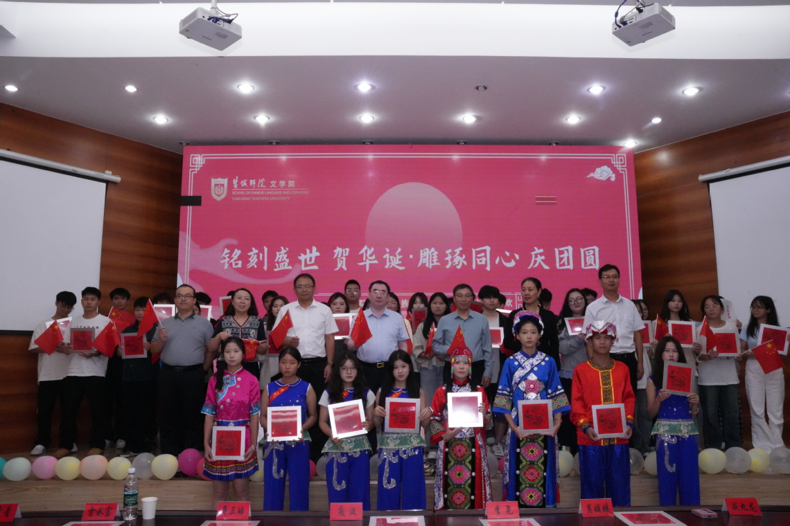 活动中,朗诵《少年中国说》生动诠释当代青年学子心系家国、报效祖国的凌云志向与赤诚热忱,国色今人汉服社的《劝学》将中华传统服饰的华美与古典文学的深厚底蕴展现得淋漓尽致,充分展现学子积极向上的精神风貌。在非遗体验环节中,盐都区雕版印刷非遗项目负责人戚九龙现场演示雕版印刷技艺,师生亲手创作融合双节元素的雕版印刷作品,不仅让民族学生在亲手操作中直观感受传统技艺的独特魅力,更在潜移默化中增进对中华优秀传统文化的认同感、自豪感和归属感,促进了各民族文化的交流互鉴。
