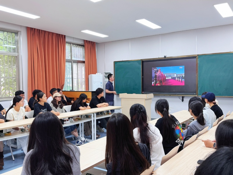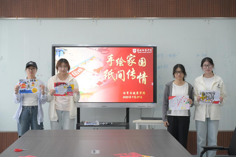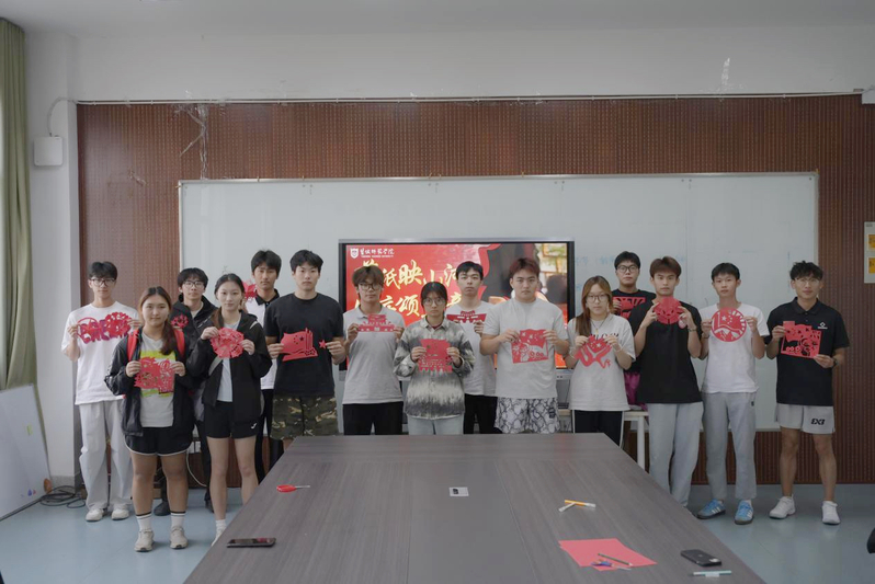 体育与健康学院相关主题活动包括传统剪纸艺术体验、手抄报创作以及专场观影。在“剪纸映山河,国庆颂华章”剪纸活动现场,同学们以红纸为材,巧手翻飞,精心剪制出五星、长城等生动的剪纸作品,表达对祖国的深情祝福。在“手绘家国,指尖传情”手抄报创作活动中,大家将爱国之情融入笔墨色彩之间。一幅幅作品生动多彩,既有对祖国壮丽山河的描绘,也有对新时代发展的赞美,真切表达了同学们对祖国的热爱与祝福。全体新生还集中观看电影《建国大业》。