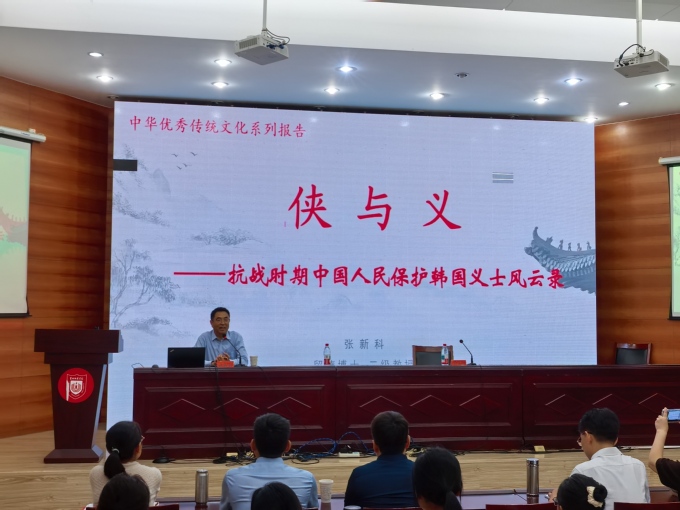 10 月 12 日上午,江苏省社科联党组书记、常务副主席张新科教授应邀在通榆校区南园报告厅内作题为《侠与义—— 抗战时期中国人民保护韩国义士风云录》的专题讲座,深入解读伟大抗战精神的丰富内涵与时代价值。学校党委常委、副校长毕凤珊主持讲座。
