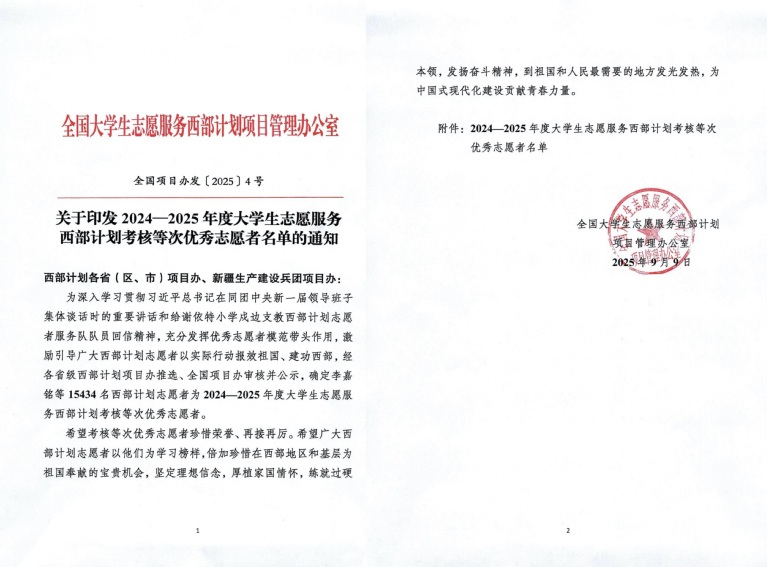 近日,全国大学生志愿服务西部计划项目管理办公室发布《关于印发2024—2025年度大学生志愿服务西部计划考核等次优秀志愿者名单的通知》。开元官网12位学子凭借在基层岗位上的扎实表现与突出成绩,成功入选西部计划考核等次优秀志愿者名单。