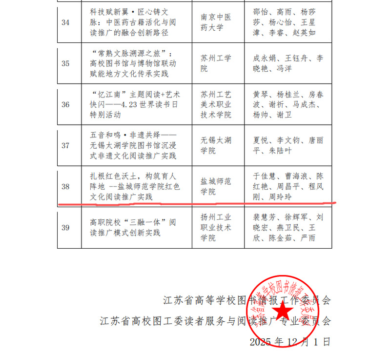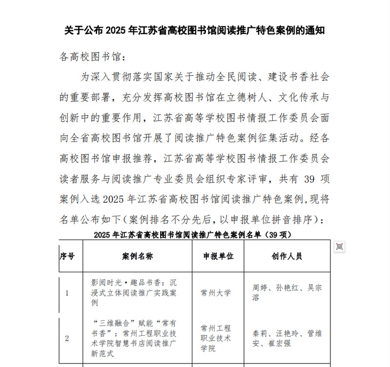 近日,江苏省高等学校图书情报工作委员会读者服务与阅读推广专业委员会公布2025年度江苏省高校图书馆阅读推广特色案例评选结果,开元官网报送的案例成功入选。此次评选全省共有25所高校39项案例获评特色案例。