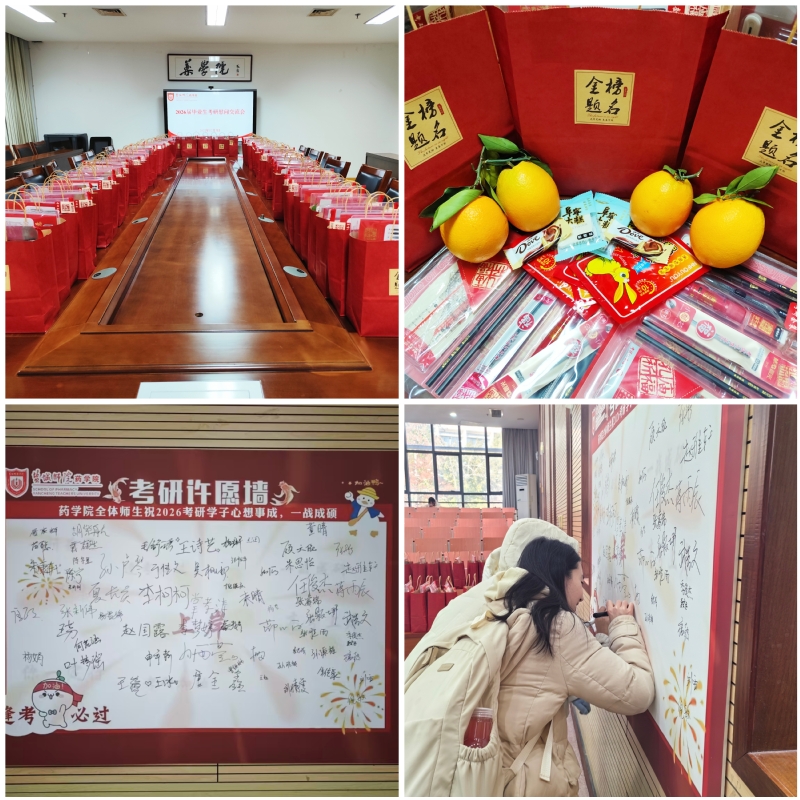 徐华对药学院考研工作成效给予充分肯定,并向全力冲刺的备考学生致以亲切问候,他希望考研学子要锚定目标、坚定信念,以“不破楼兰终不还”的决心全力以赴;要科学规划、张弛有度,合理分配复习时间,提高备考效率;要调整心态、从容应考,以最佳精神状态迎接即将到来的挑战。随后,徐华与学院领导班子成员为考研学子送上“考研加油包”,礼包内不仅有寓意“心想事成”的橙子、象征“步步高升”的阜宁大糕,还有巧克力、文具套装、暖宝宝以及抽纸等实用物品,每一件都承载着学院对学子们的深切关怀与美好期许。
