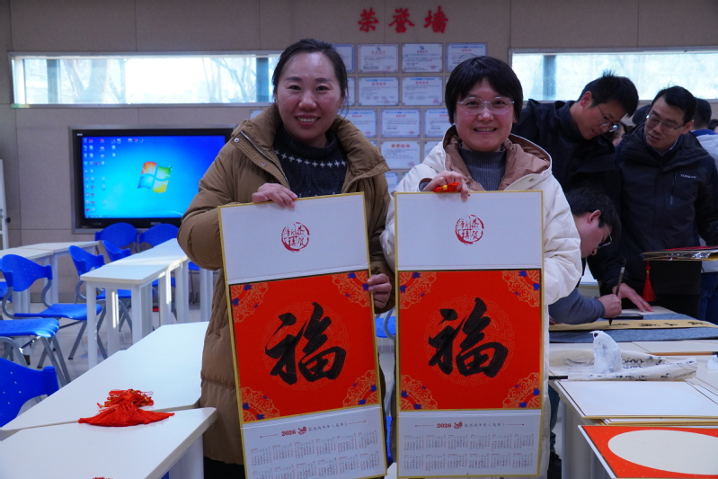 活动现场暖意融融,张桂华与现场教职工亲切交流,详细了解创作情况。在挥毫泼墨之间,一个个饱满厚重、寓意吉祥的“福”字,一张张意境悠远的国画台历陆续成形,围观的教职工纷纷拿出手机,记录下这精彩的创作瞬间。在活动特设的免费赠字画环节,师生按需领取现场创作的台历、福字,将定制的专属祝福作品带回家。