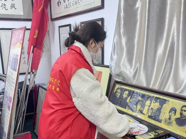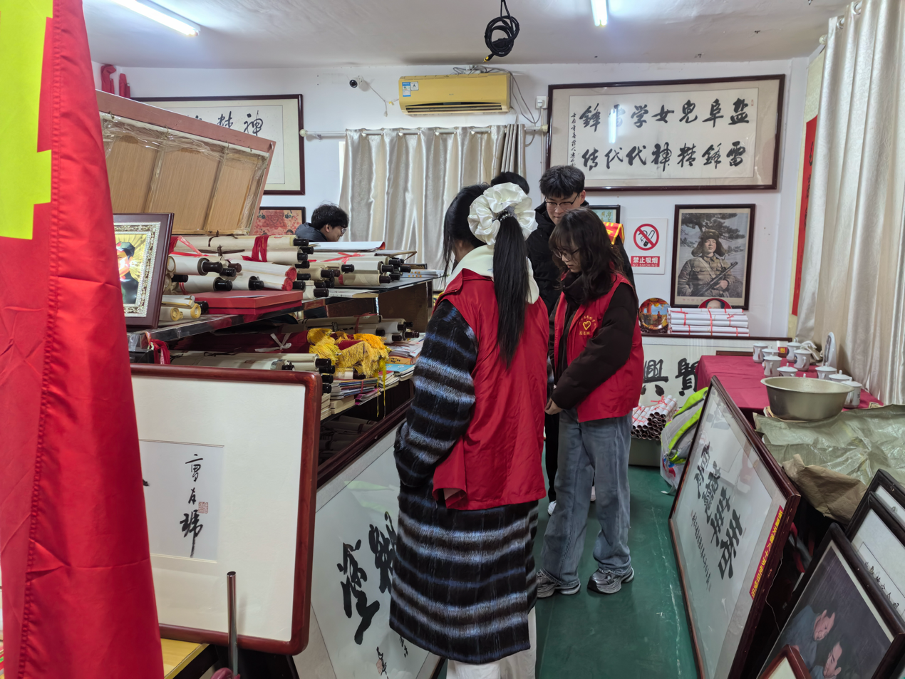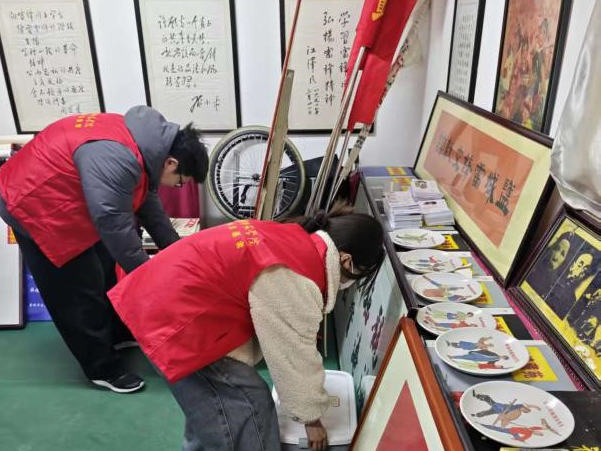 参观结束,志愿者们手持扫帚,细致打扫馆内地面,拂去浮尘,归置杂物,让文献馆焕然一新、整洁明亮,并帮忙将一幅书写着“雷锋事迹 铭记不忘”的书法作品悬挂于墙上。