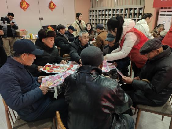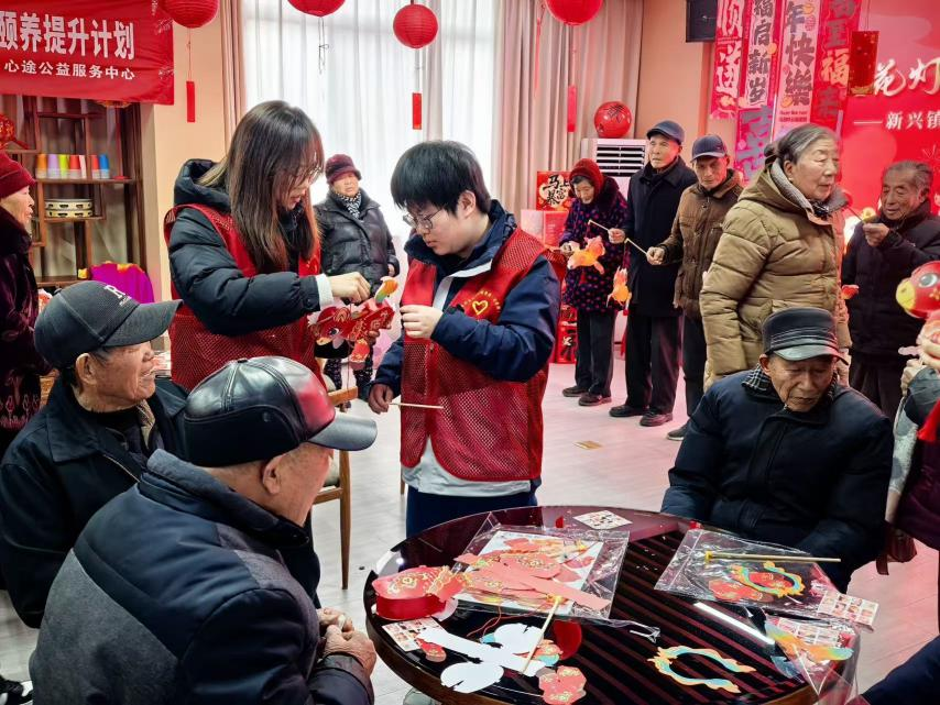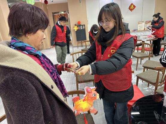 活动现场暖意融融,工作人员与志愿者提前布置场地,准备好安全环保的花灯材料、暖心元宵与手写祝福卡片,全力保障老年朋友的参与体验。活动中,工作人员详细讲解了元宵节习俗与活动流程。手工制灯是活动亮点,志愿者采用 “一对一” 协助模式,耐心指导老人完成剪裁、粘贴、组装等步骤,手把手带领大家制作花灯。老人们兴致盎然,动手参与并交流心得,普通材料化作一盏盏特色花灯。随后,花灯展示、猜灯谜、元宵习俗问答等互动环节依次开展,老人们积极抢答,在欢乐中感受传统文化魅力、分享节日喜悦。志愿者还为每位老人送上汤圆礼盒与真挚祝福,朴素的话语饱含关爱,老人们脸上洋溢着幸福笑容。