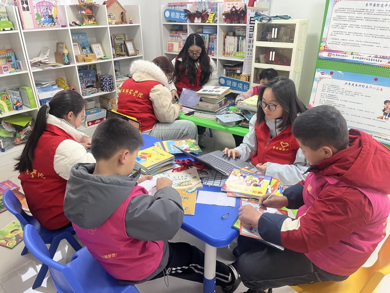捐赠仪式结束后,志愿者迅速分工协作,全身心投入到图书整理工作中。大家耐心带领社区儿童一起行动,有条不紊地为每一本图书粘贴专属检索标签,细致核对图书基础信息、按类别规范归档摆放,同时依托专业优势,熟练将图书信息汇编成电子版台账,进一步优化规范图书管理流程,方便孩子们后续便捷借阅。志愿者们用十足的耐心与细心,为社区儿童打造出整洁有序、温馨舒适的阅读环境。