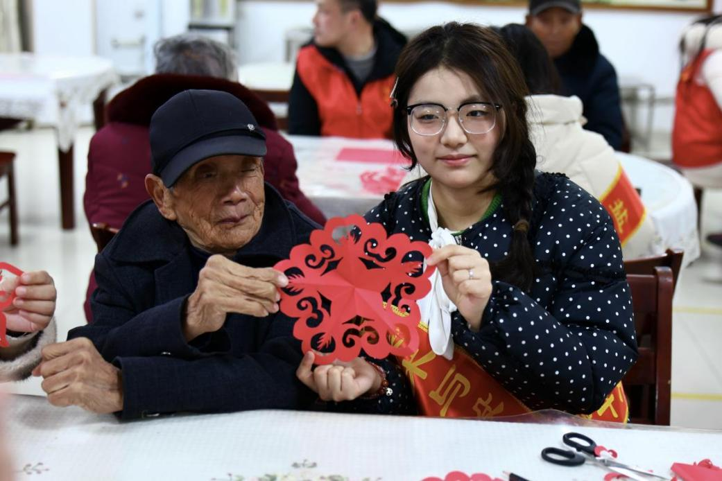 活动围绕学雷锋志愿服务主题,融合非遗文化传承与敬老爱老行动,内容丰富、温情满满。活动中,志愿者走进老人居所细心清扫卫生、整理生活物品,以点滴行动为老人们营造整洁舒适的生活环境,用实际行动诠释雷锋精神的奉献内涵。同时,发挥专业特色开设“非遗剪纸”美育微课堂,现场为老人们讲解剪纸的历史渊源、技法要点,手把手指导老人动手创作。从折纸、画样到裁剪,志愿者们耐心细致、逐一指导,老人们兴致盎然、认真实践,在指尖的巧思与创作中感受非遗文化的独特魅力。一张张红纸在老人们的手中变换成各式各样的精美剪纸作品,现场欢声笑语不断,温馨的氛围感染着每一个人。社区工作人员与志愿者还为老人们送上精心准备的慰问礼品,将关怀与温暖切实送到老人心坎上。