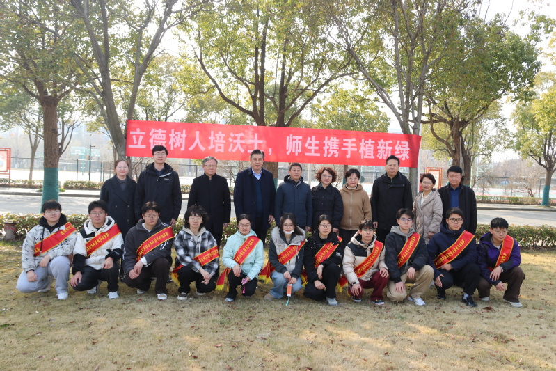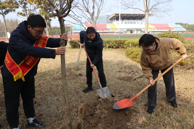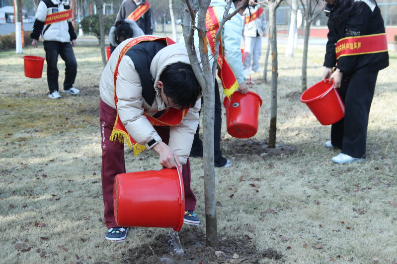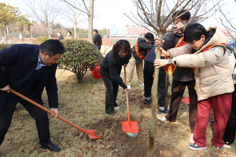 活动现场暖意融融、干劲十足。校领导率先垂范,与大学生志愿者分工协作、默契配合,挥锹挖坑、扶苗填土、踩实浇灌,每一个动作都认真细致、有条不紊。参与活动的志愿者中,既有朝气蓬勃的低年级学子,也有即将告别校园、奔赴人生新征程的毕业生,他们以青春之名,共同为校园增添新绿、寄托心愿。活动尾声,师生为树苗系上亲手书写的祝福卡片,卡片上满载对学业精进、学校发展和生态文明的美好期许,将师生的赤子之心与绿色发展愿景紧密相连。