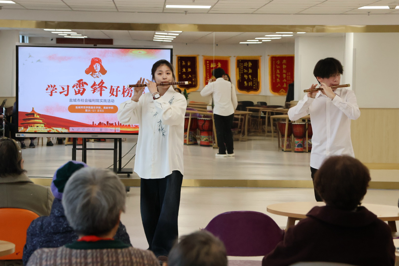 一周后,他们将这份精神转化为实际行动。3月18日,同学们走进盐城市社会福利院,为老人们送去春日温暖。演出在合唱《学习雷锋好榜样》中拉开帷幕,二胡独奏《赛马》、竹笛合奏《扬鞭催马运粮忙》、舞蹈《最炫民族风》等节目轮番登场,赢得阵阵掌声。最后,全体志愿者与老人们共唱《我和我的祖国》。演出结束后,同学们还与老人亲切交谈,教他们使用智能设备,现场暖意融融。
