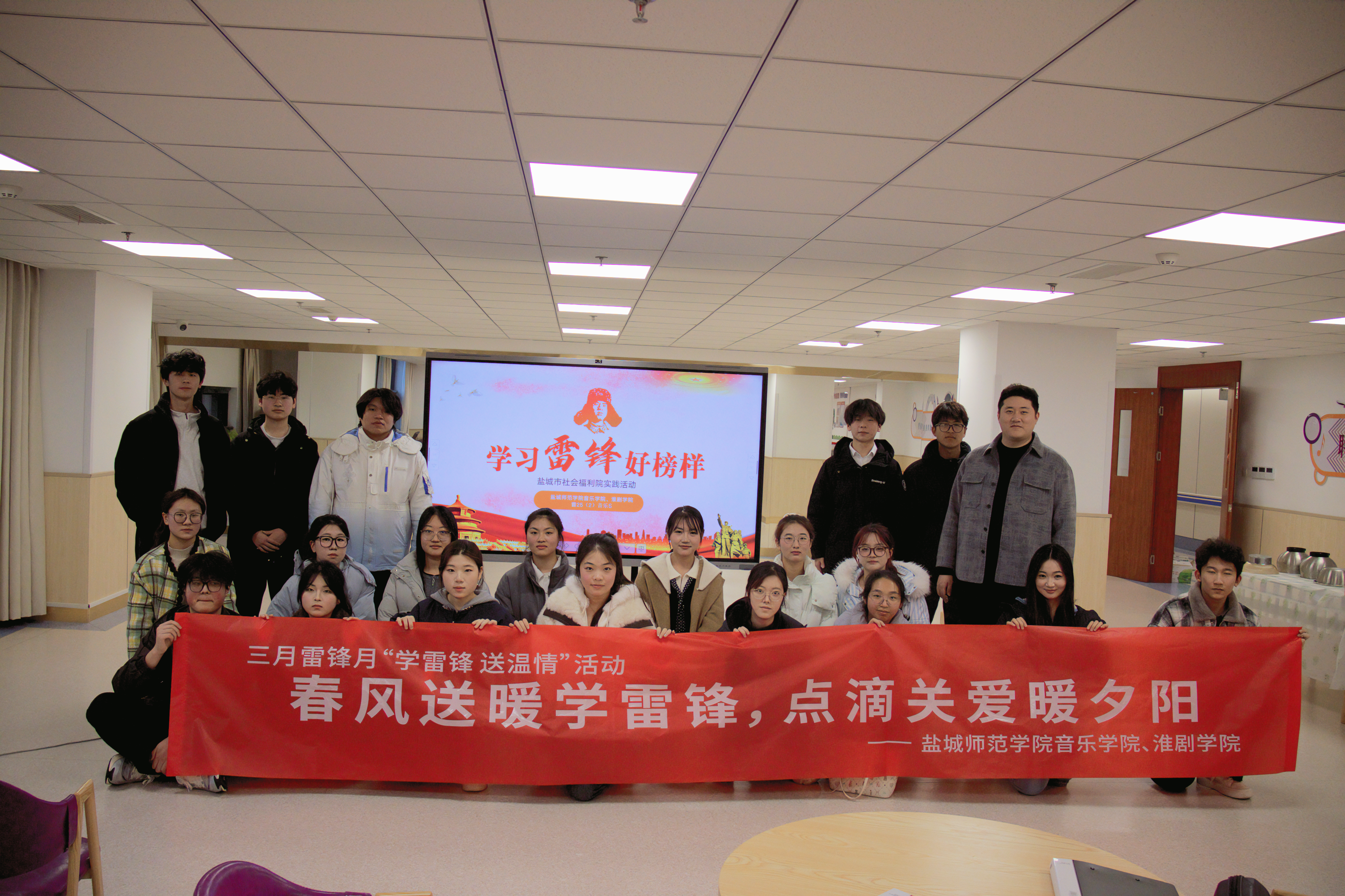 春风送暖学雷锋,点滴关爱暖夕阳。在这个特殊的“学雷锋月”里,音乐学院、淮剧学院252班的同学们用两周时间,完成了一场从红色沃土到温情港湾的精神接力。3月18日,他们走进盐城市社会福利院,用一场精彩纷呈的慰问演出为老人们送去春日的温暖与欢笑,将一周前在新四军纪念馆汲取的精神力量,化作了服务社会的生动实践。
