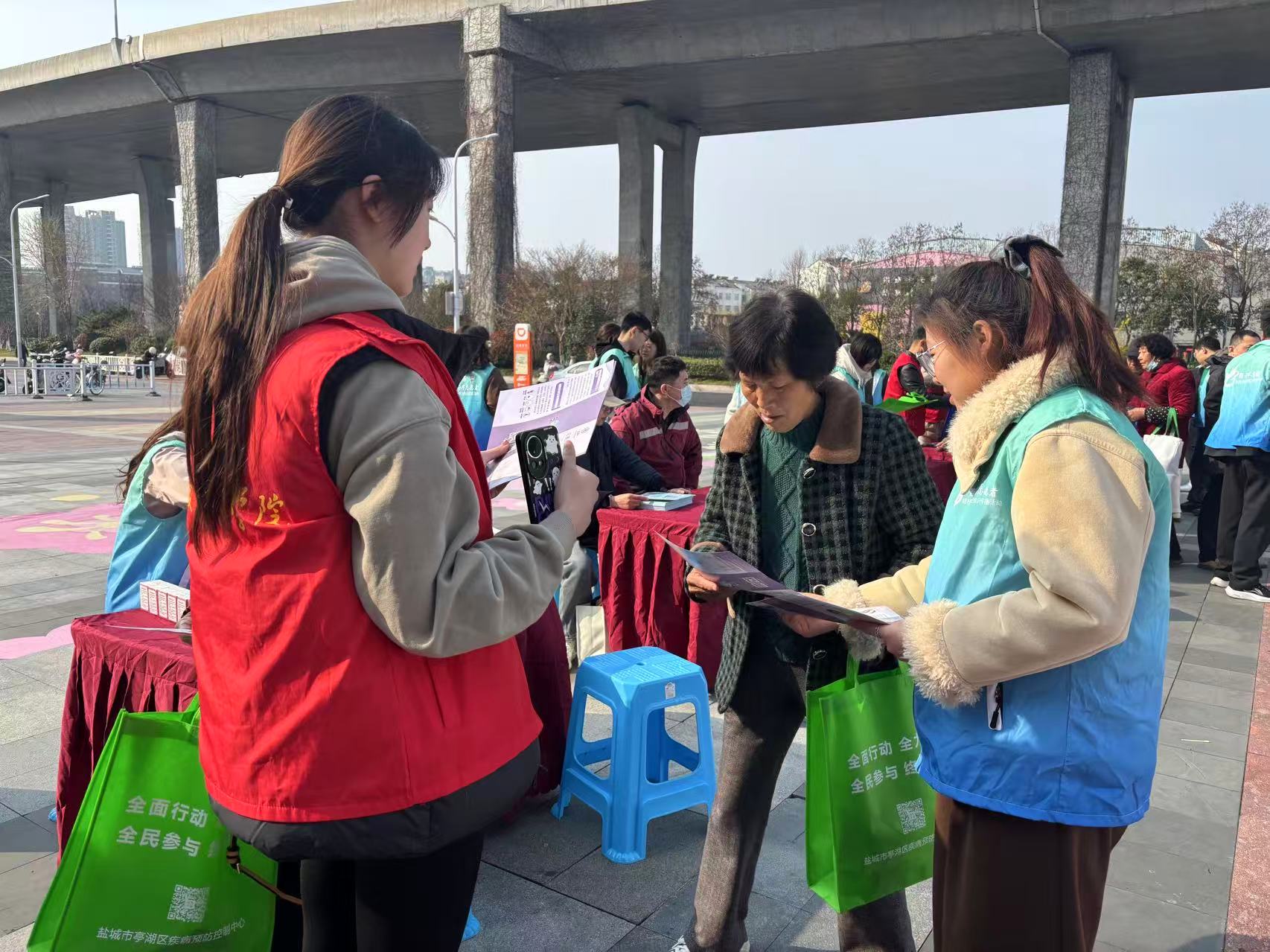 活动现场人头攒动,气氛热烈。来自盐城市第一人民医院、盐城市第二人民医院、盐城市第三人民医院、盐城市第七人民医院等医疗机构的医护人员现场坐诊,免费为市民测量血压、血糖,提供一对一健康咨询。针对群众关心的结核病诊疗、家庭内传播预防、疑似症状处置等热点问题,医护人员逐一细致解答,纠正认知误区。学生志愿者们各司其职,有的在义诊区引导市民有序排队,有的穿梭在人群中发放宣传折页。她们面带微笑,一边递上宣传资料,一边用通俗易懂的语言普及结核病防治知识。
