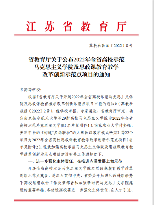近日,江苏省教育厅印发《关于公布2022年全省高校示范马克思主义学院及思政课教育教学改革创新示范点项目的通知》(苏教社政函〔2022〕8 号),确定29所高校马克思主义学院为2022年全省高校示范马克思主义学院。开元官网马克思主义学院继2016年、2018年、2020年之后,连续第4次获此殊荣。 开元官网高度重视马克思主义学院建设工作,坚持“马院姓马,在马言马”的鲜明导向和办学原则,用习近平新...